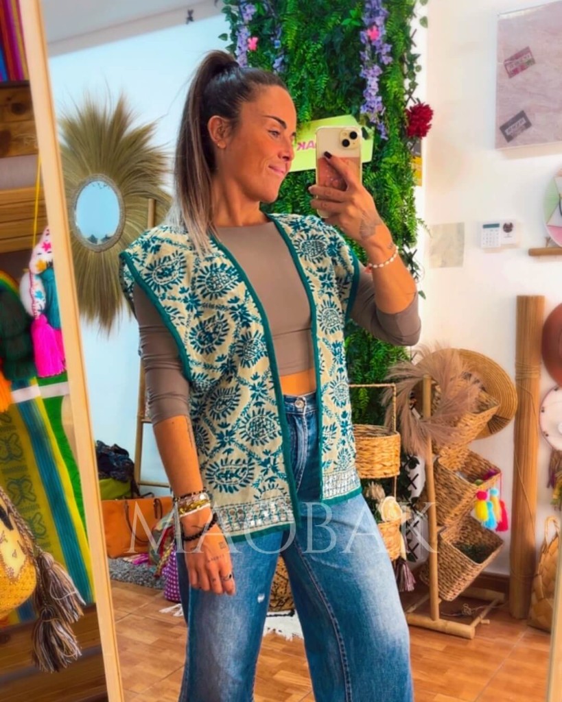 Color, alegría y mucha personalidad. Nuestros Chalecos Capri estan elaborados de manera artesanal, en India, con bordados llenos de detalles y tonos vibrantes que lo hacen único.