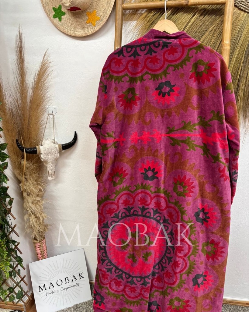 El Kimono Zanzíbar Velvet Suzani Maxi está confeccionado en terciopelo de algodón, con un tacto suave y envolvente que lo convierte en una prenda única para quienes aman las piezas con carácter y alma.