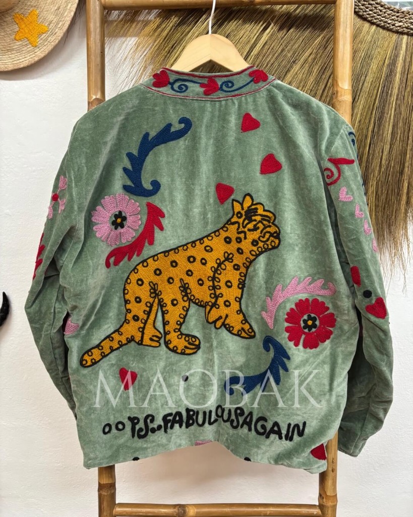 La Chaqueta Zanzíbar Velvet Suzani está confeccionada en terciopelo de algodón, con bordados tradicionales inspirados en el arte Suzani, símbolo de protección, amor y abundancia.