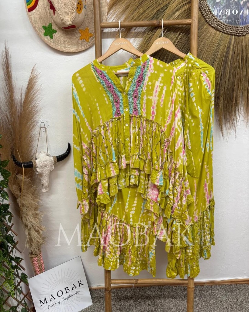 Su estampado tie dye artesanal hace que cada prenda sea completamente única, con colores vibrantes que elevan cualquier look, ya sea para un evento especial, una cena veraniega o simplemente para sentirte increíble cualquier día.