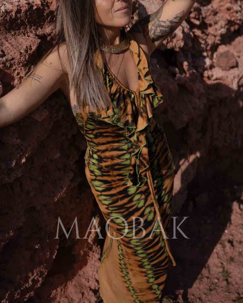 Vestidos elaborados con porcentaje en elastano, teñido a mano a través de la técnica del tie dye tradicional tailandés. Su volante en la parte central hace que disimule y puedas colocarlo sin nada debajo. Es multiposición ya que tiene dos cuerdas en la parte frontal y en la parte del cuello para poder colocarlas como mejor te sientas. Su espalda al aire te dejará sin palabras.