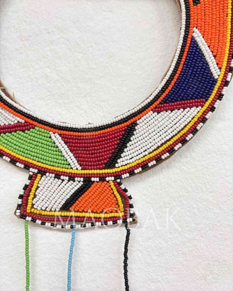 Su diseño combina cuentas de colores vibrantes con una estructura central de la que caen tres tiras largas, creando un efecto precioso y muy llamativo en el pecho. La parte trasera está rematada con acabados en piel, totalmente artesanales, que hacen de cada collar una joya única.
