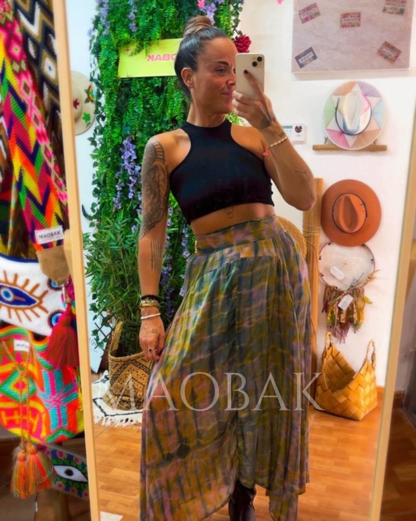 La Falda Srilanka está confeccionada en seda natural reciclada, ligera y llena de movimiento. Su estampado tie dye, teñido a mano, convierte cada pieza en una creación única e irrepetible.