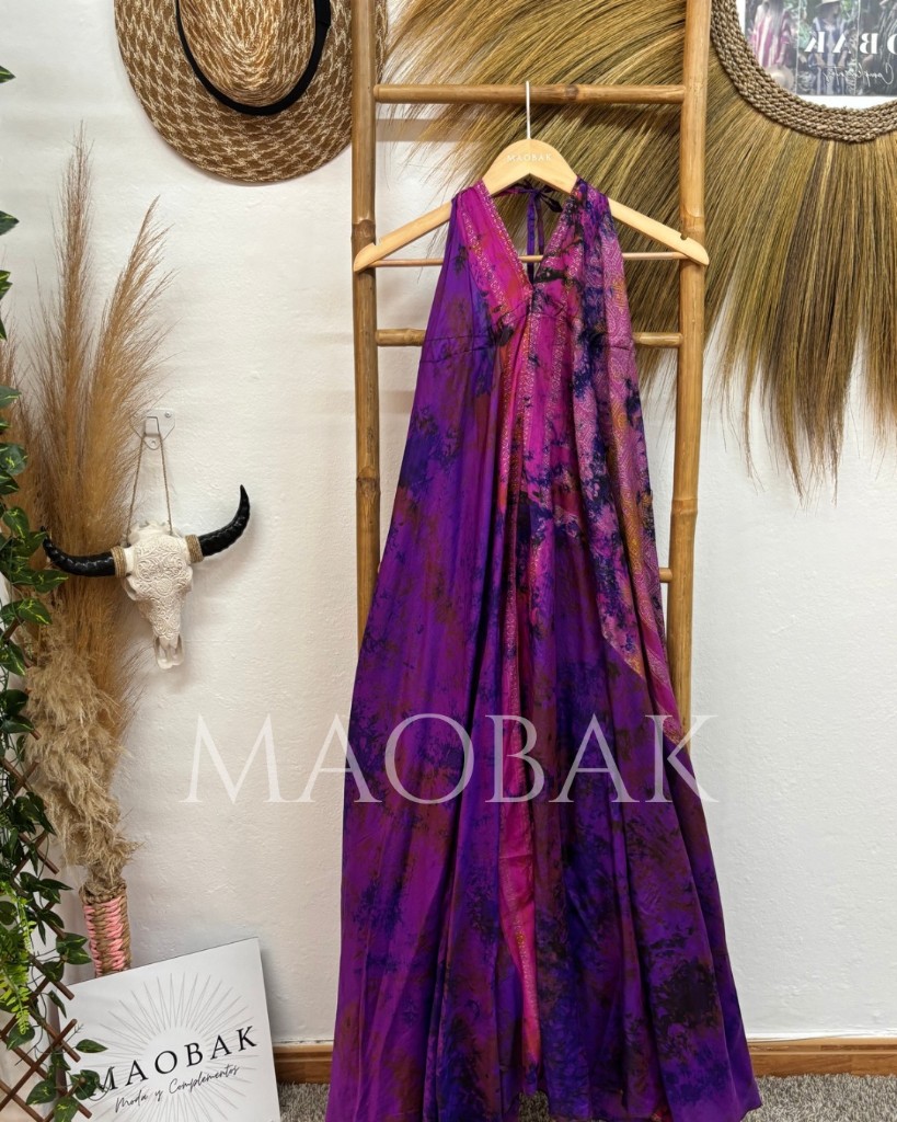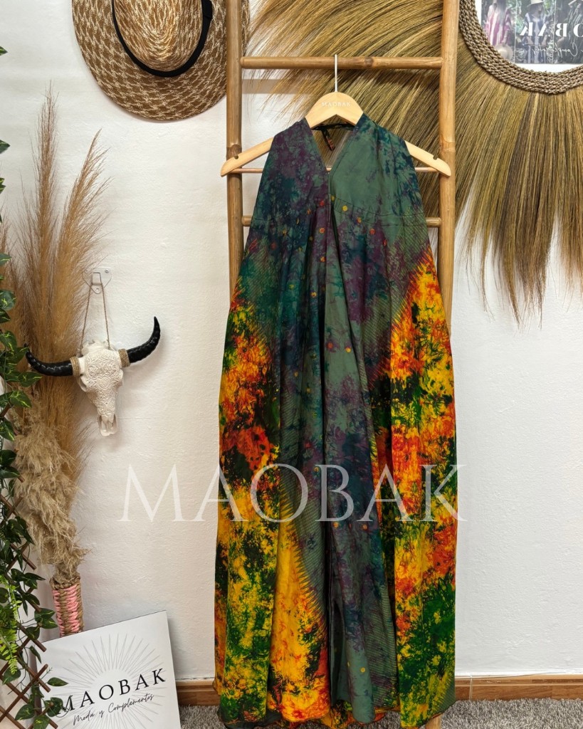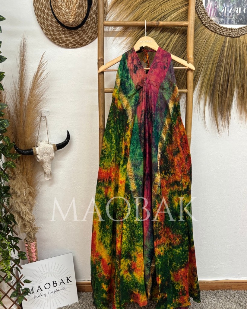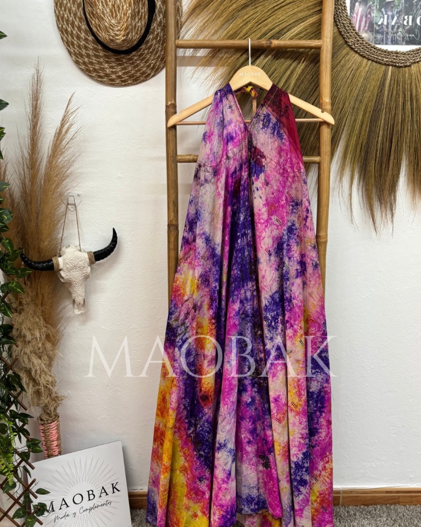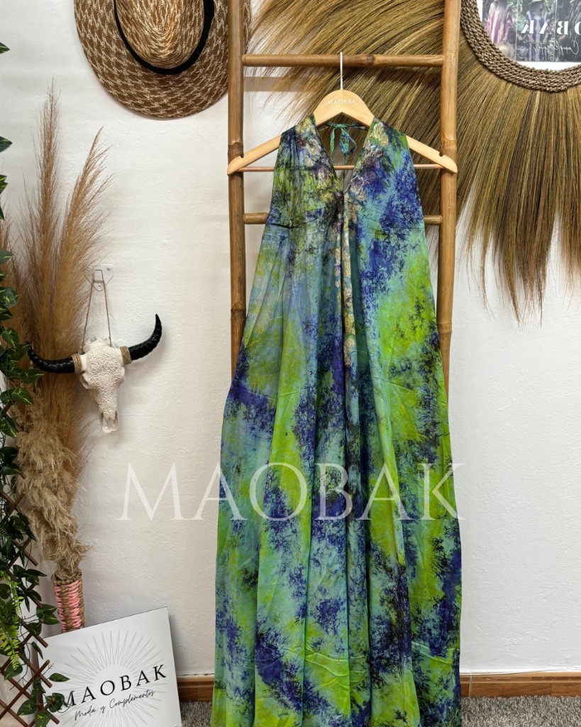 Vestido elaborado en seda natural 100%. Su orígen es India y el hecho de que el estampado esté elaborado en tie dye hace que cada prenda sea única y exclusiva. Se anuda en variedad de formas y se ajusta a cada talla con cuerdas tanto en la parte de la espalda como en la del cuello.