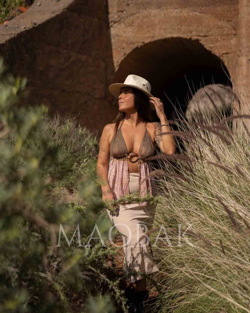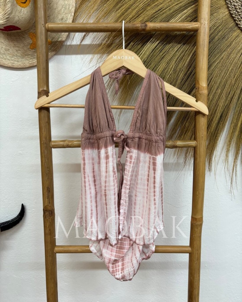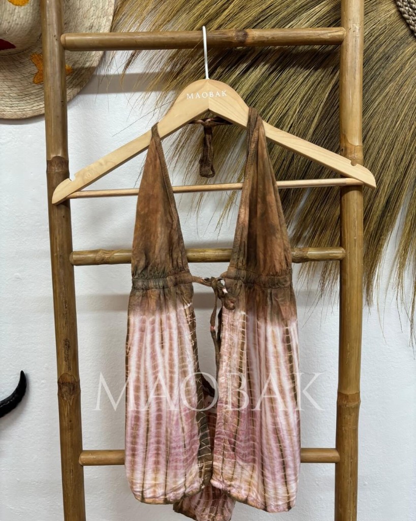 Un top ligero y versátil que juega con el movimiento y la frescura. Elaborado en rayón tie-dye, con un suave degradado que combina tonos tierra y rosados.