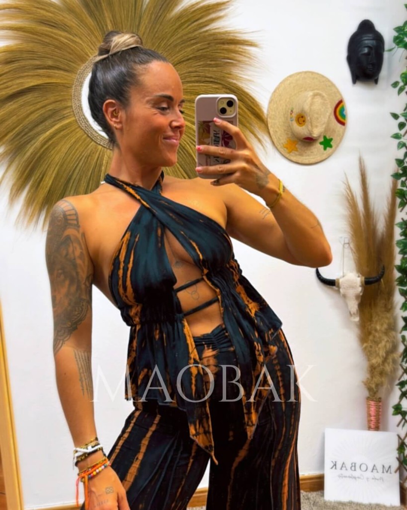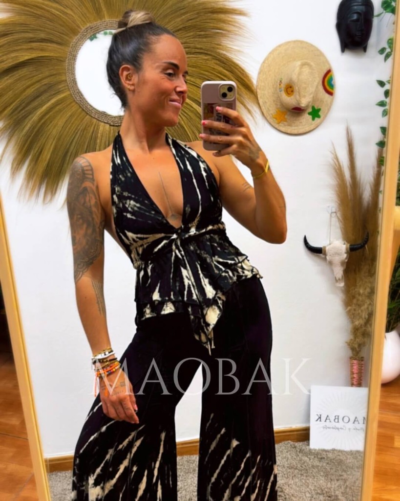 Eleva tu look con este top halter elaborado en rayón suave con estampado tie-dyecon porcentaje en elastano.
