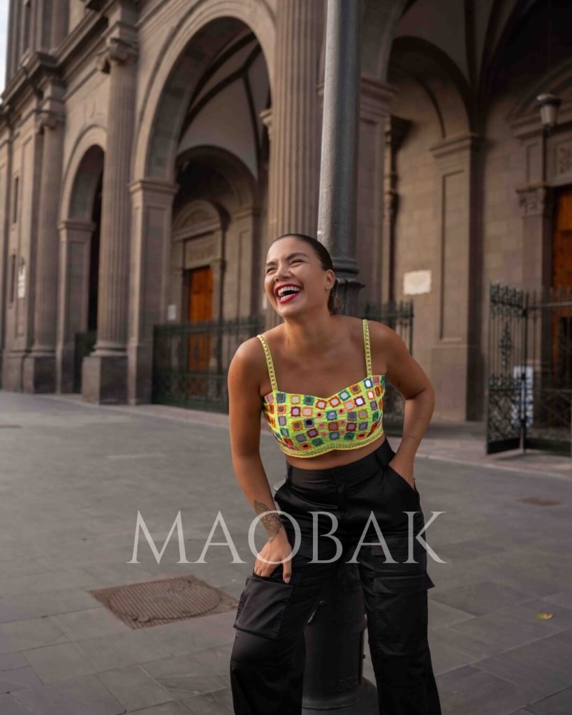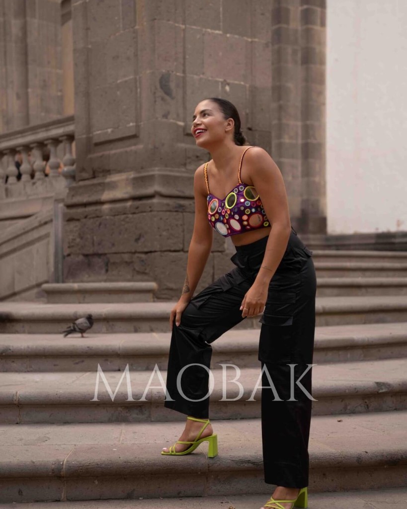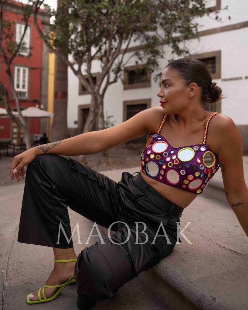 Cada espejo, cada puntada, está hecho a mano, convirtiendo este top en una joya textil que no pasa desapercibida.