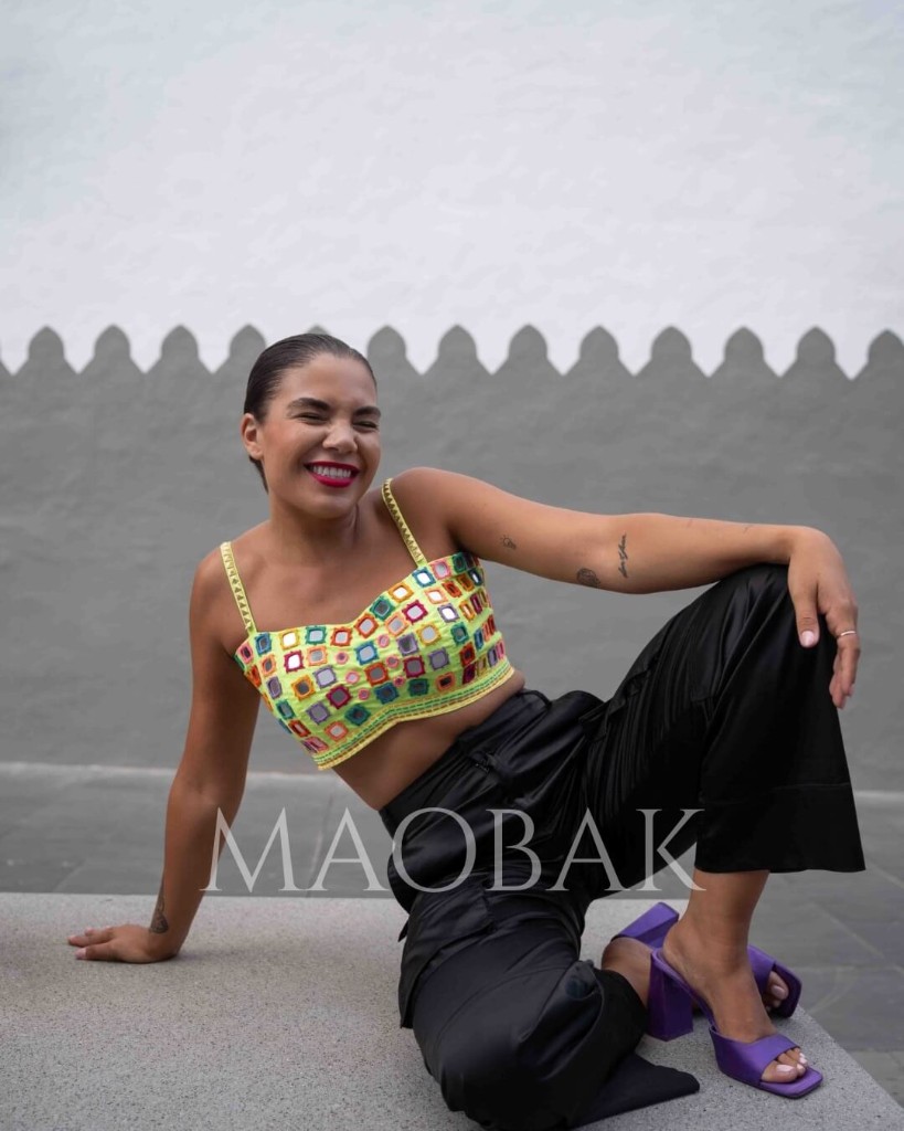 Este top corto, diseñado en Gujarat (India) exclusivamente para MAOBAK, está elaborado con la ancestral técnica del mirror work o bordado de espejos, símbolo de protección y energía positiva.