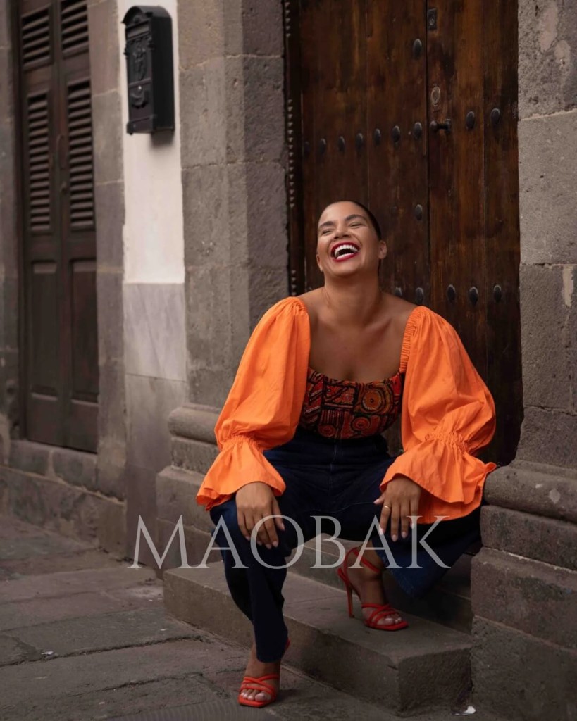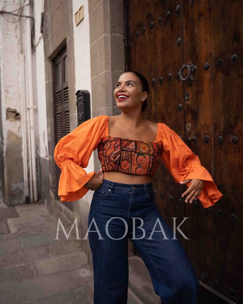Su tejido combina estructura y suavidad, mientras que las mangas amplias abullonadas en tono naranja intenso le aportan ese carácter único que no pasará desapercibido. La espalda descubierta con lazo ajustable realza la silueta con un toque de sensualidad y elegancia.