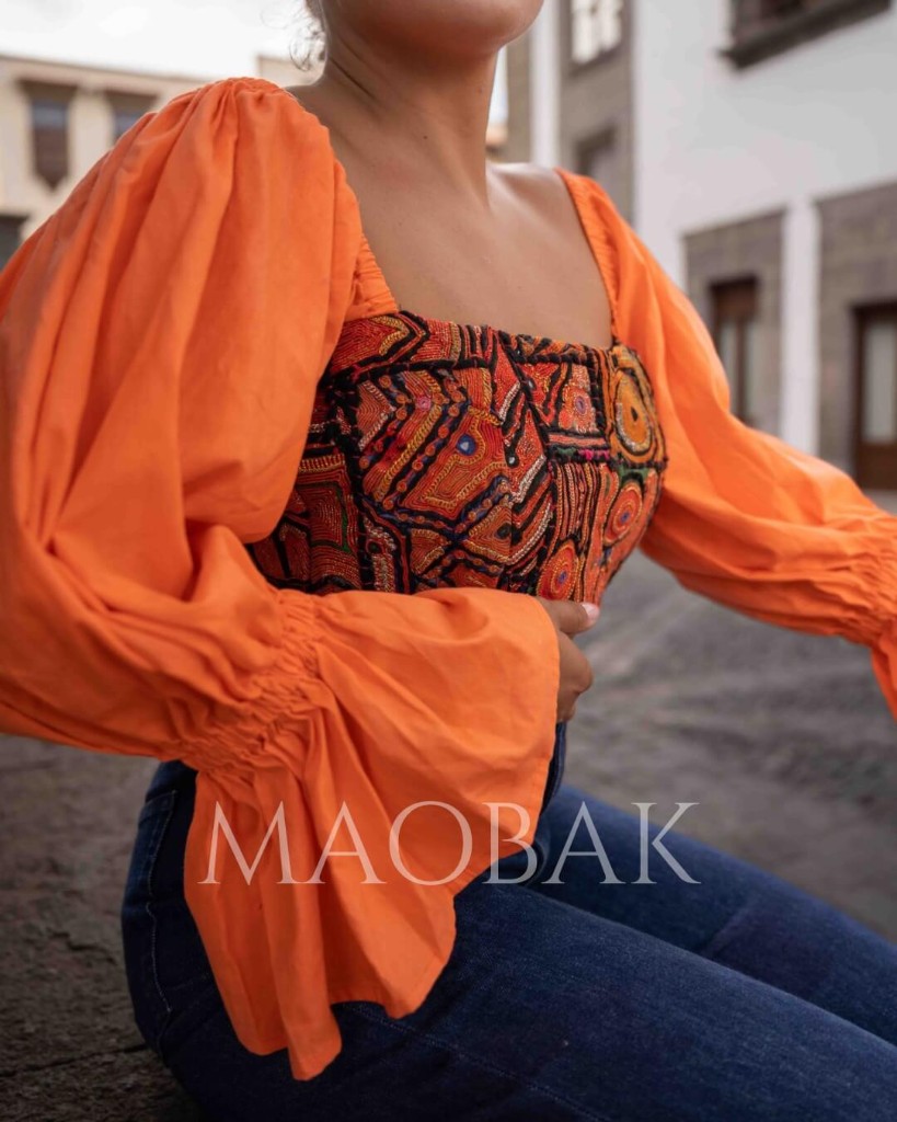 Una pieza que desborda fuerza y feminidad. Este top está elaborado artesanalmente en la India con bordados tradicionales que evocan el lujo de los palacios del Taj Majal, reinterpretados en un diseño contemporáneo y vibrante.
