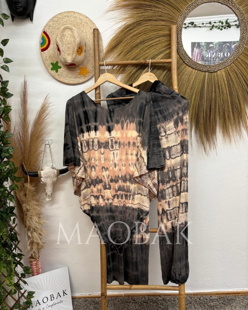 Elaborado en rayón 100% y porcentaje en spandex, teñido a mano con técnica tie-dye, logrando un efecto único que combina tonos tierra, beige y negro con una caída suave y ligera.