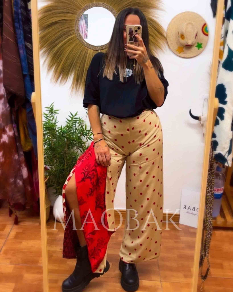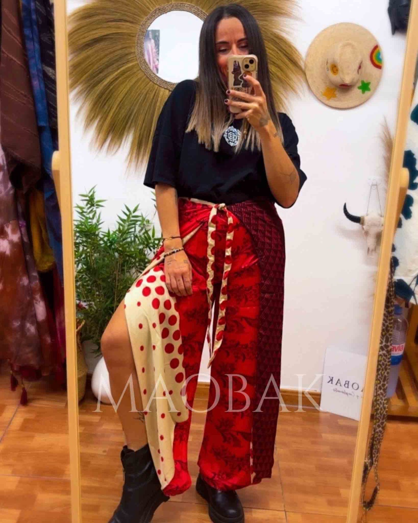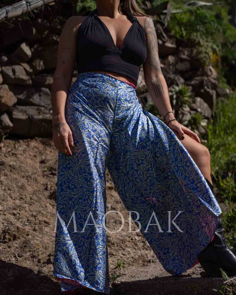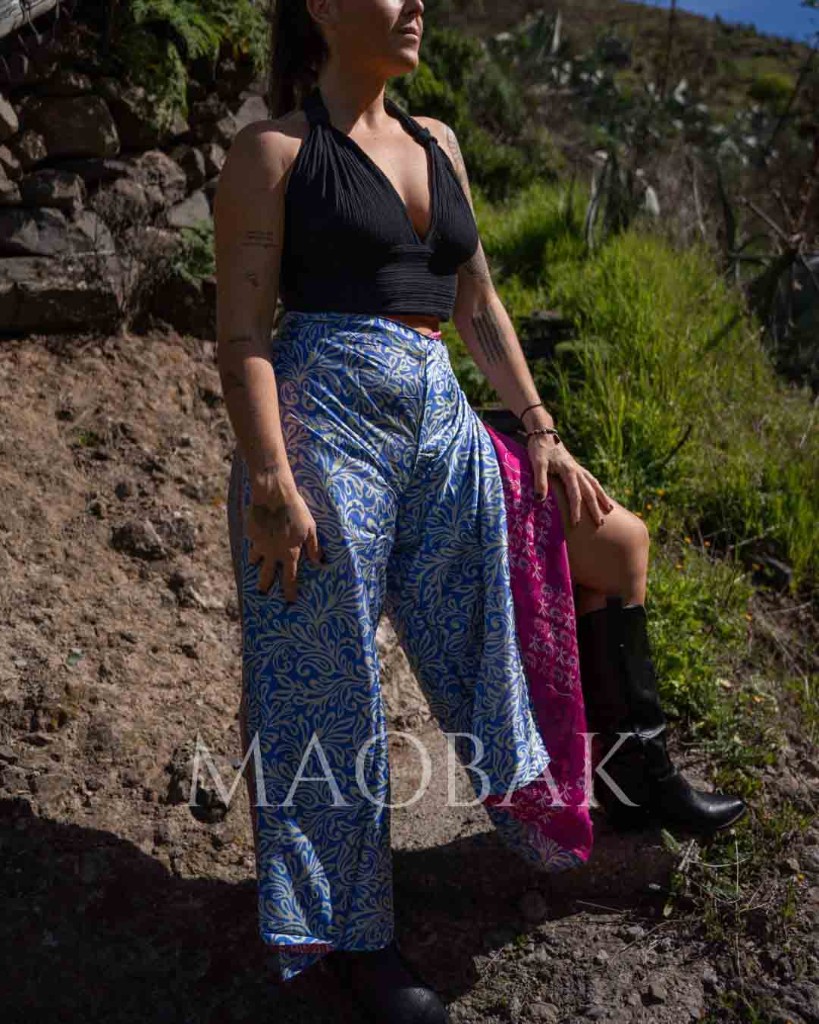 El Pantalón Mae Persia es una joya boho con esencia viajera. De forma tailandesa y corte amplio, está diseñado para aportar comodidad absoluta y movimiento, convirtiéndose en una de esas prendas que no te quieres quitar nunca.