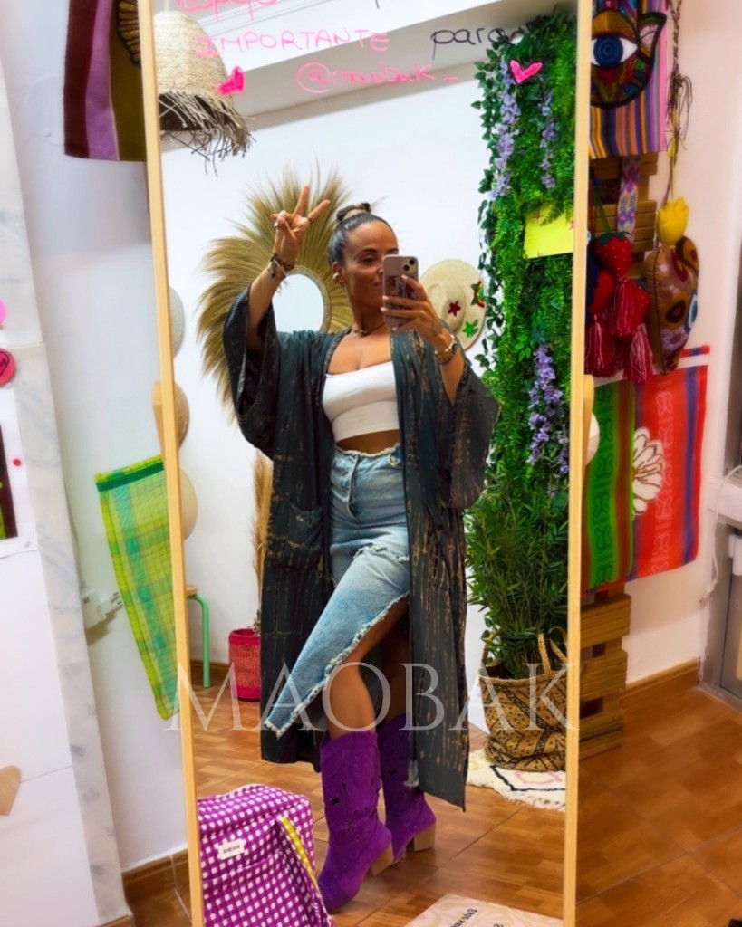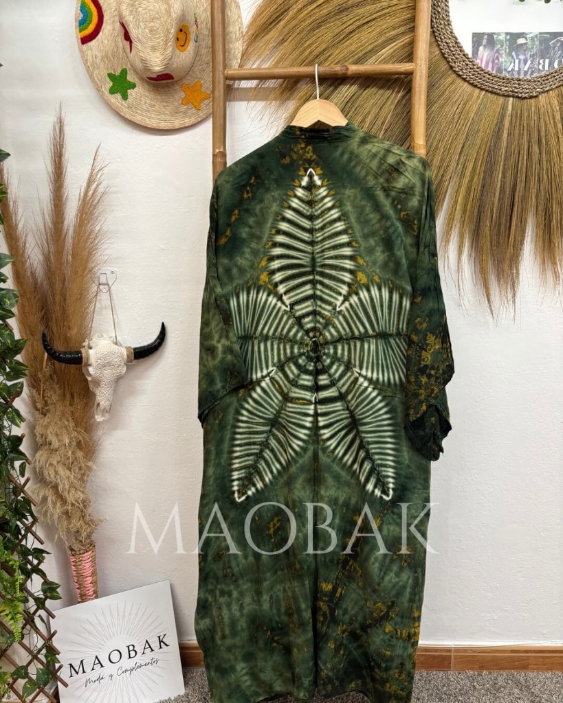 Kimono largo OVERSIZE elaborado en rayón 100% de calidad tailandesa. Con caída espectacular. Talla única. Incluye dos bolsillos amplios y cinturón. La técnica utilizada es la del tie dye al más puro style bamboo. Medidas aproximadas: 1,35x84 cm (manga 36cm)