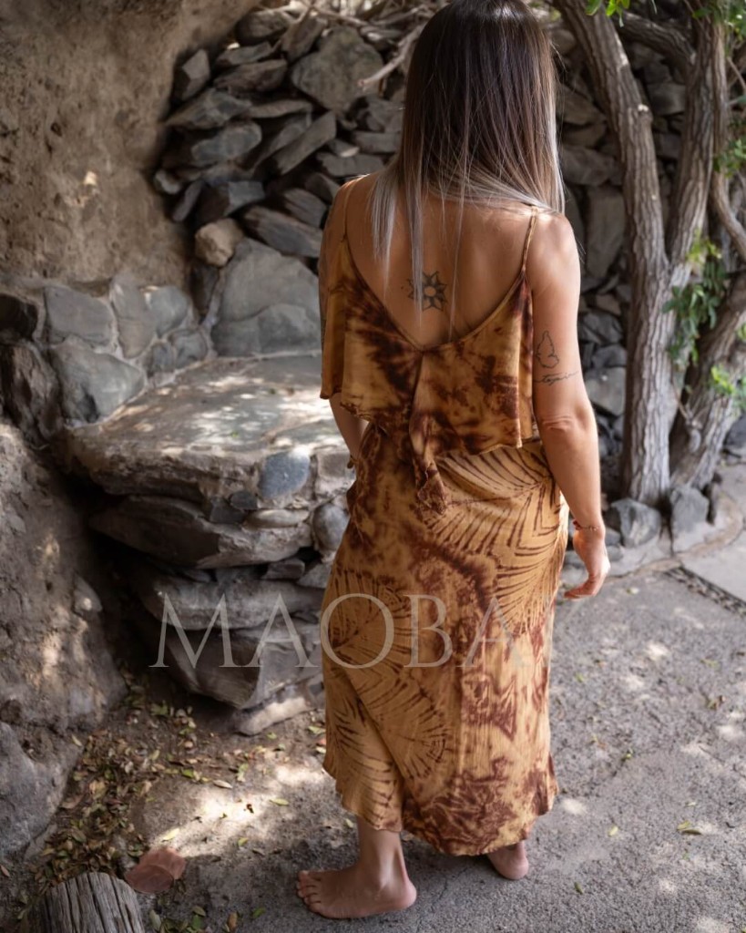 El estampado tie dye en tonos tierra, realizado de forma artesanal, hace que cada pieza sea única, con dibujos y matices irrepetibles.