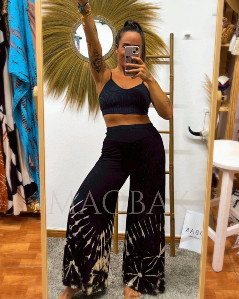 Su corte amplio y fluido estiliza la figura, mientras que el estampado tie dye artesanal en la parte inferior añade ese toque único y lleno de carácter que define a Maobak.