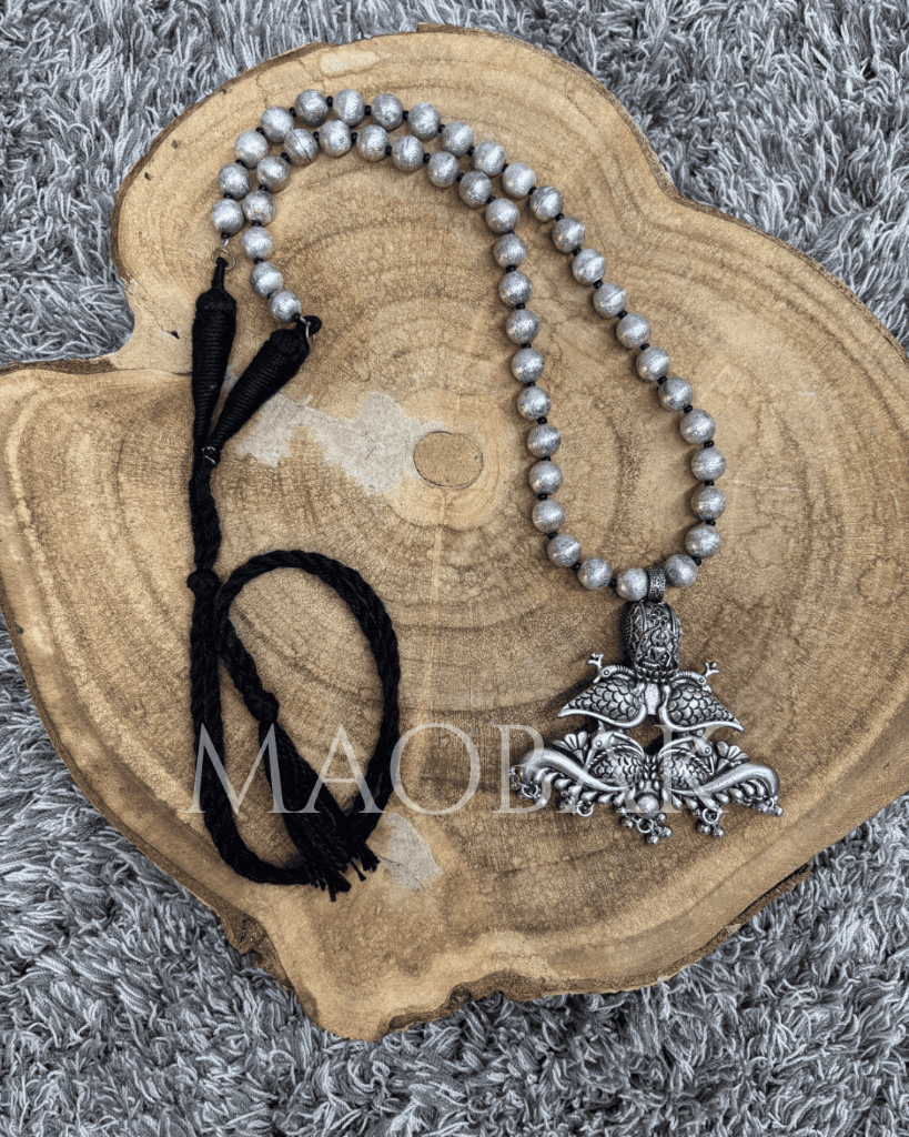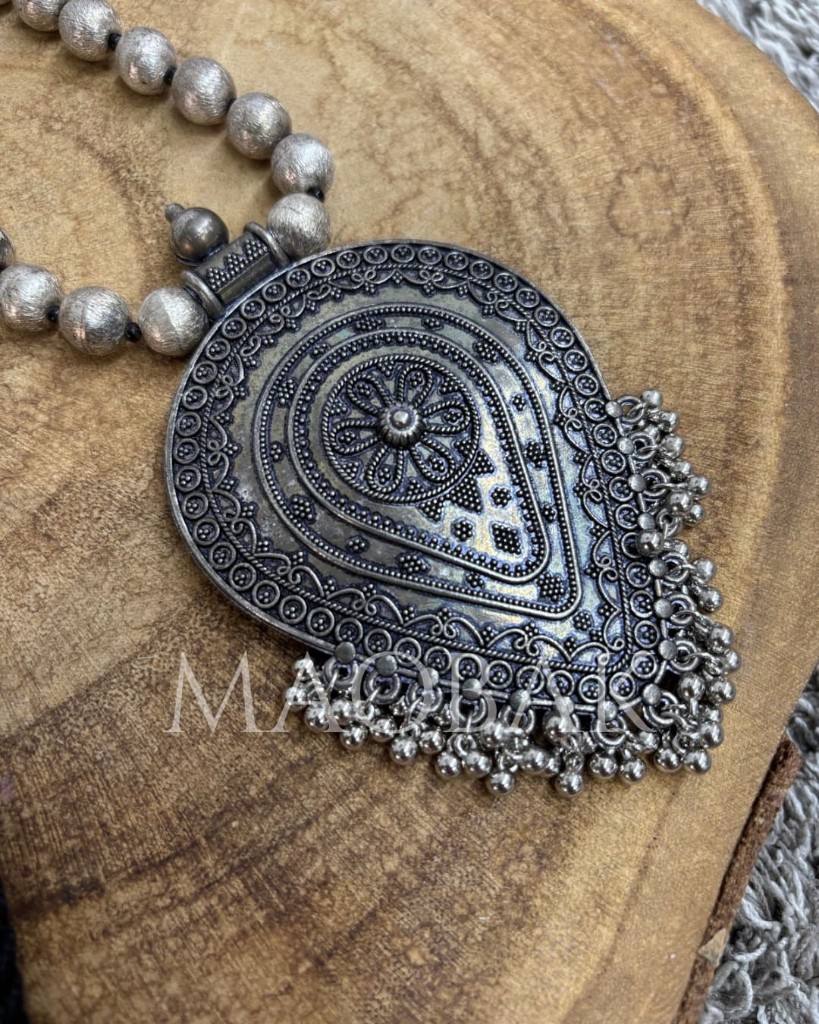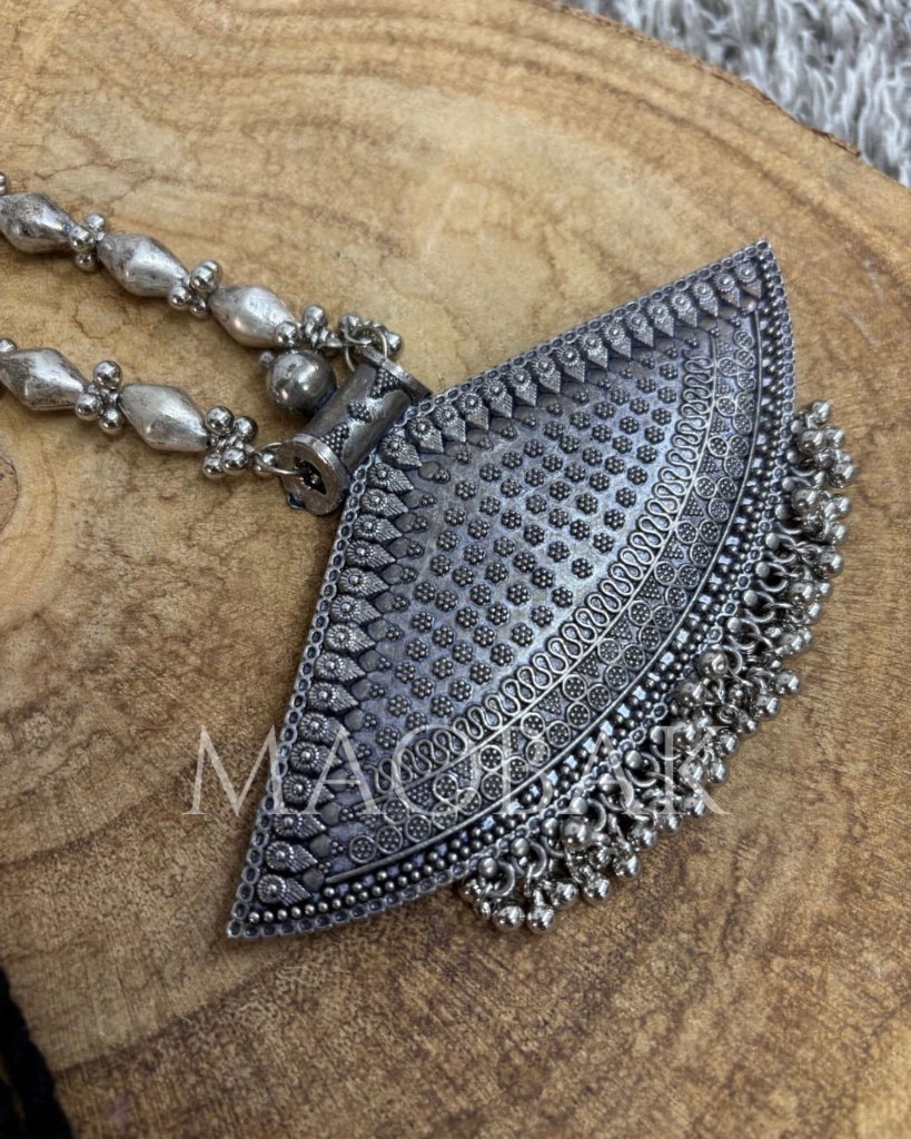Un accesorio con historia y carácter. El Collar Colgante Agra destaca por su diseño artesanal en tono plata envejecida, con figuras detalladas que evocan la tradición india.