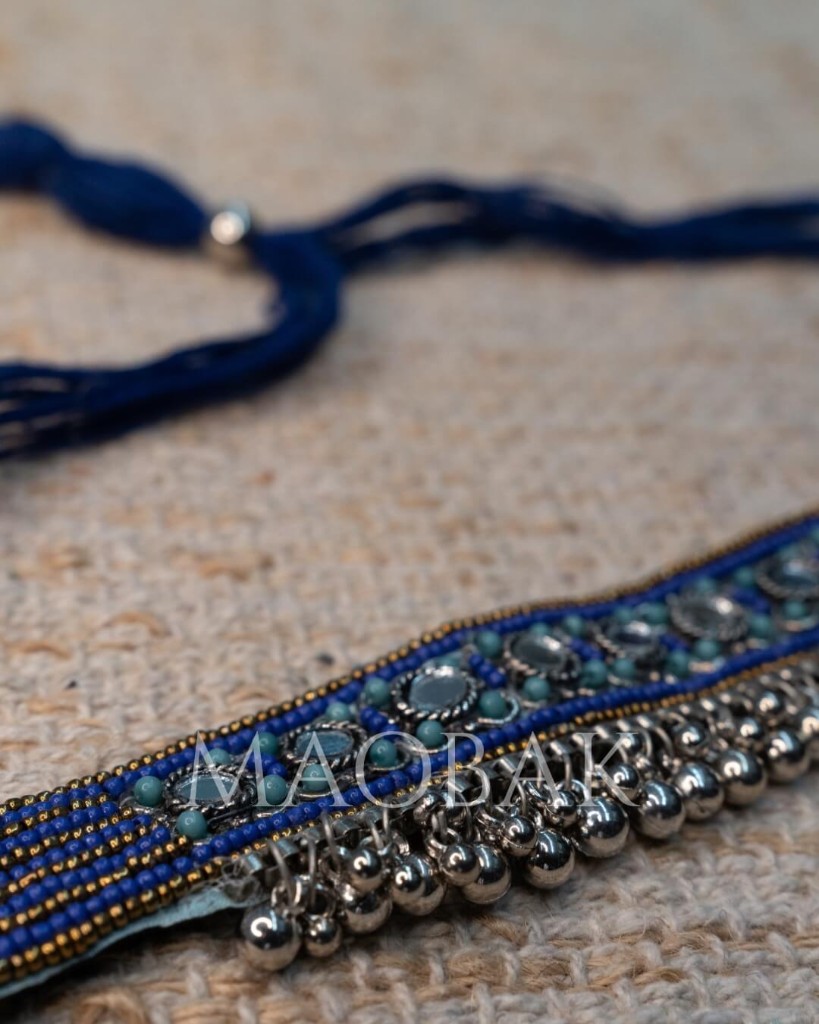 Elaborado en terciopelo suave, con bordados delicados y detalles en espejos tradicionales que reflejan la luz y protegen de las energías negativas según la tradición india.