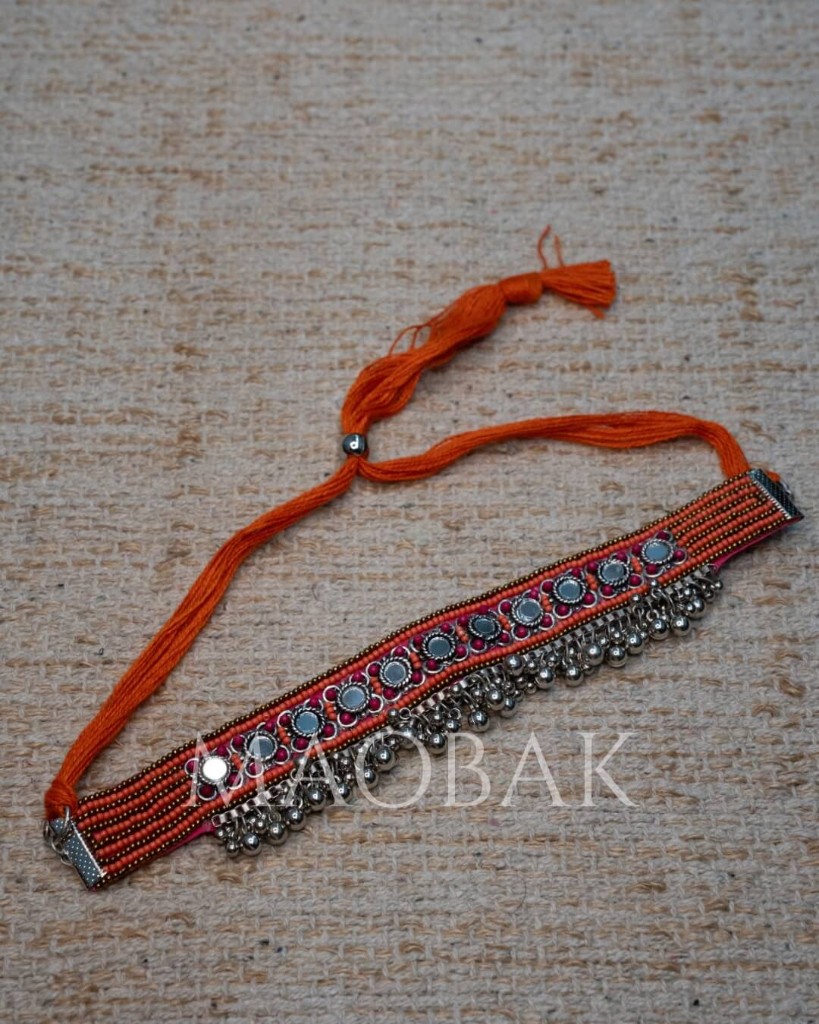 Adornado con pequeñas cuentas metálicas y abalorios que generan un movimiento sutil y elegante, este chóker es una pieza única que combina historia y modernidad.