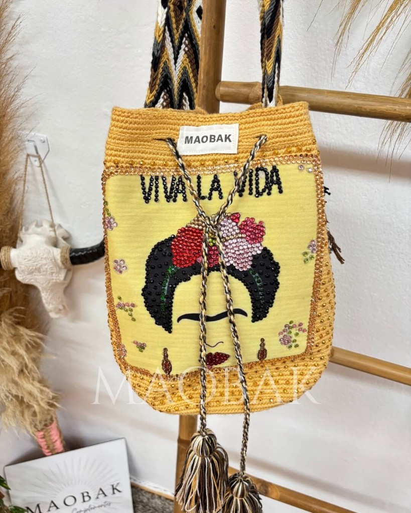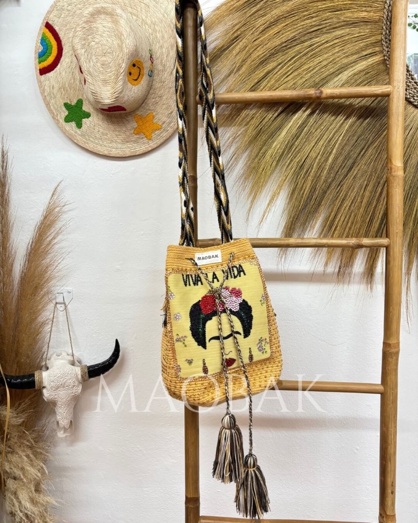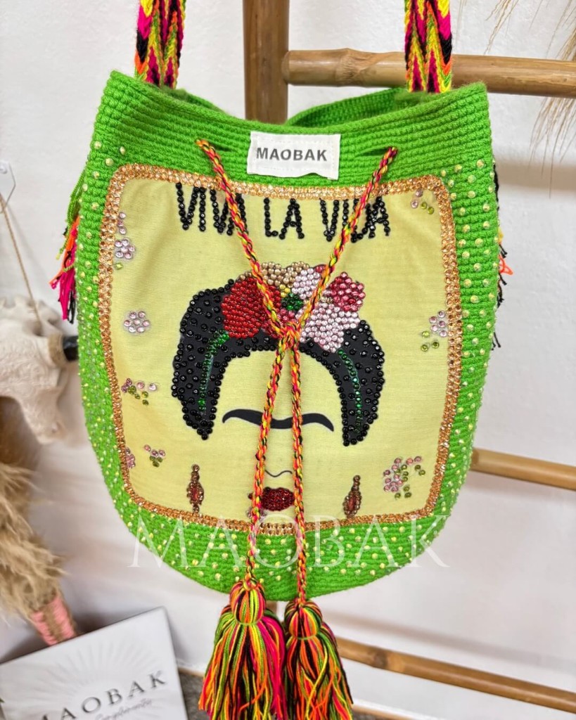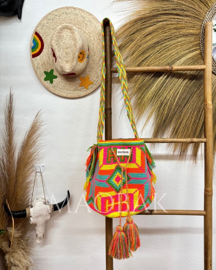 Tejida completamente a mano por mujeres de la comunidad Wajira en Colombia, cada mochila es una obra única llena de color, textura y significado.