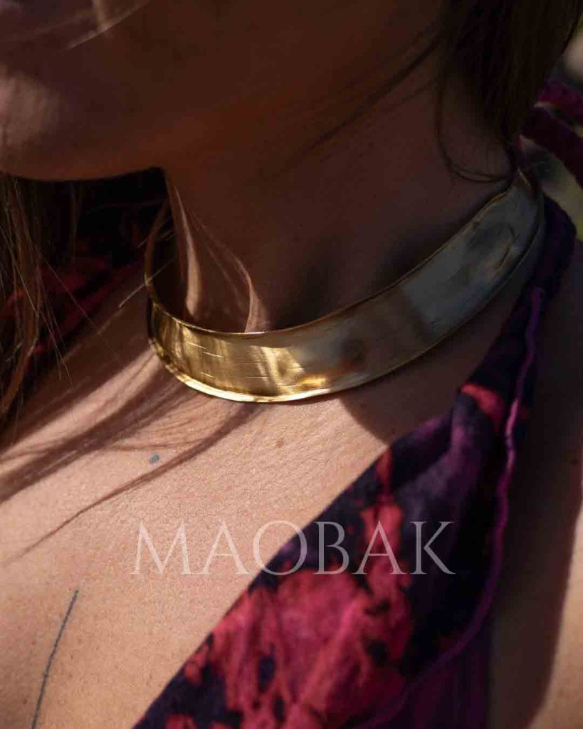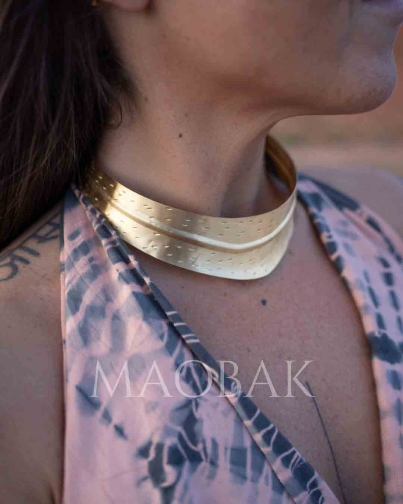 El Chóker Mix Atenea es esa pieza que transforma cualquier look al instante. Con un diseño rígido y acabado dorado, se adapta al cuello creando un efecto sofisticado y muy especial, perfecto tanto para eventos como para elevar un outfit más casual.