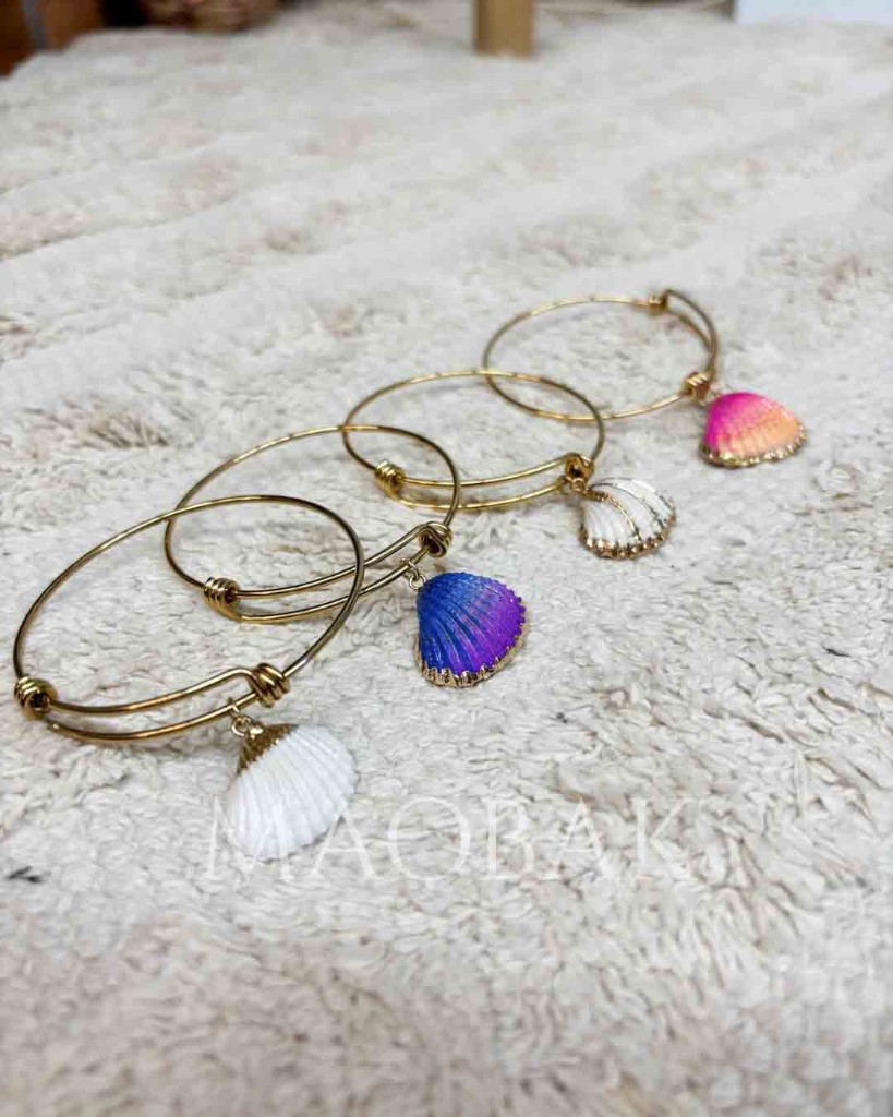 Brazaletes de acero rígidos ajustables. Detalle concha dorada en diferentes colores.