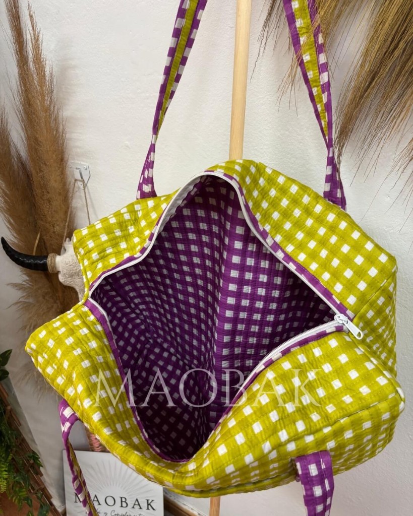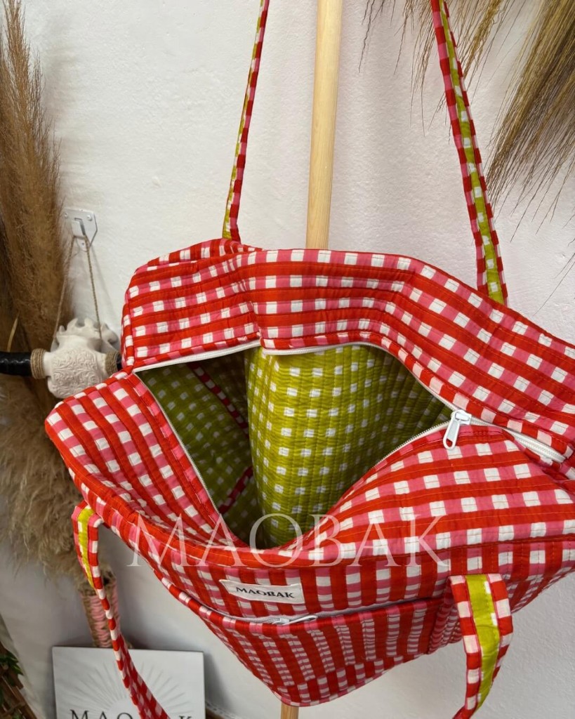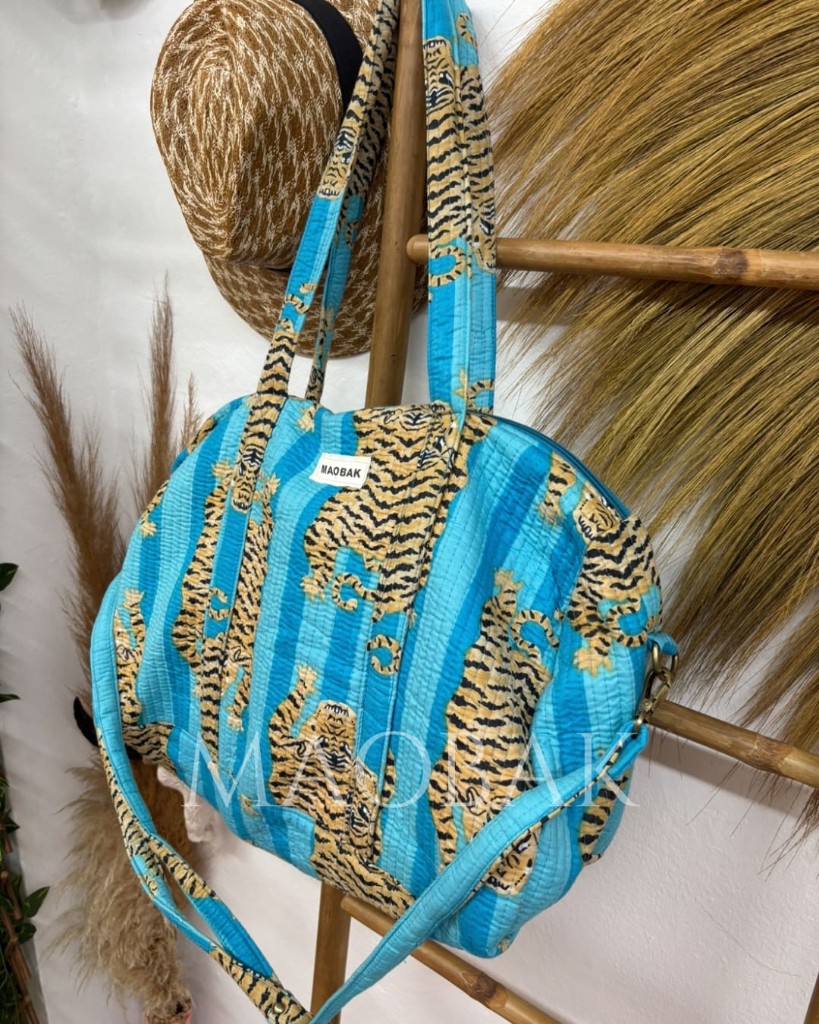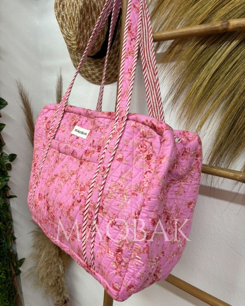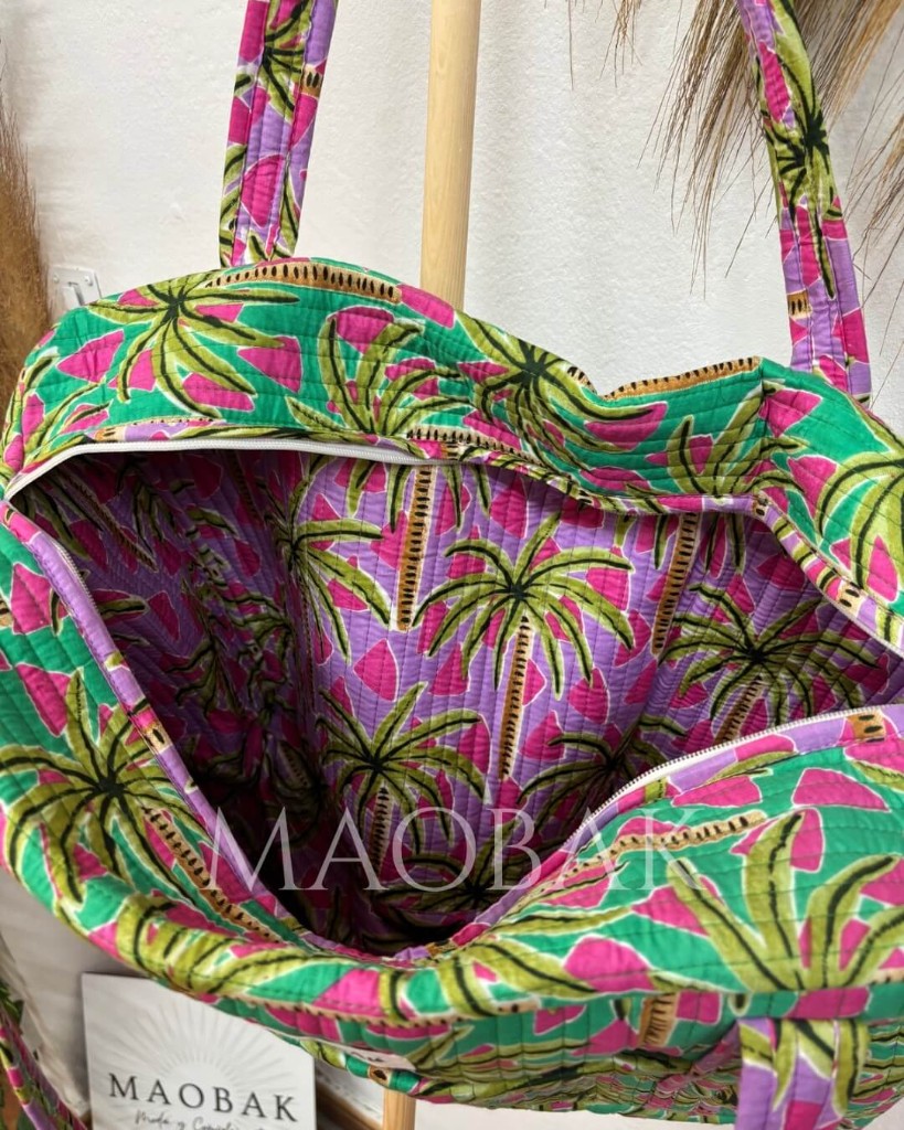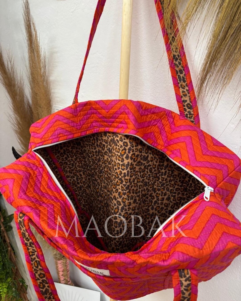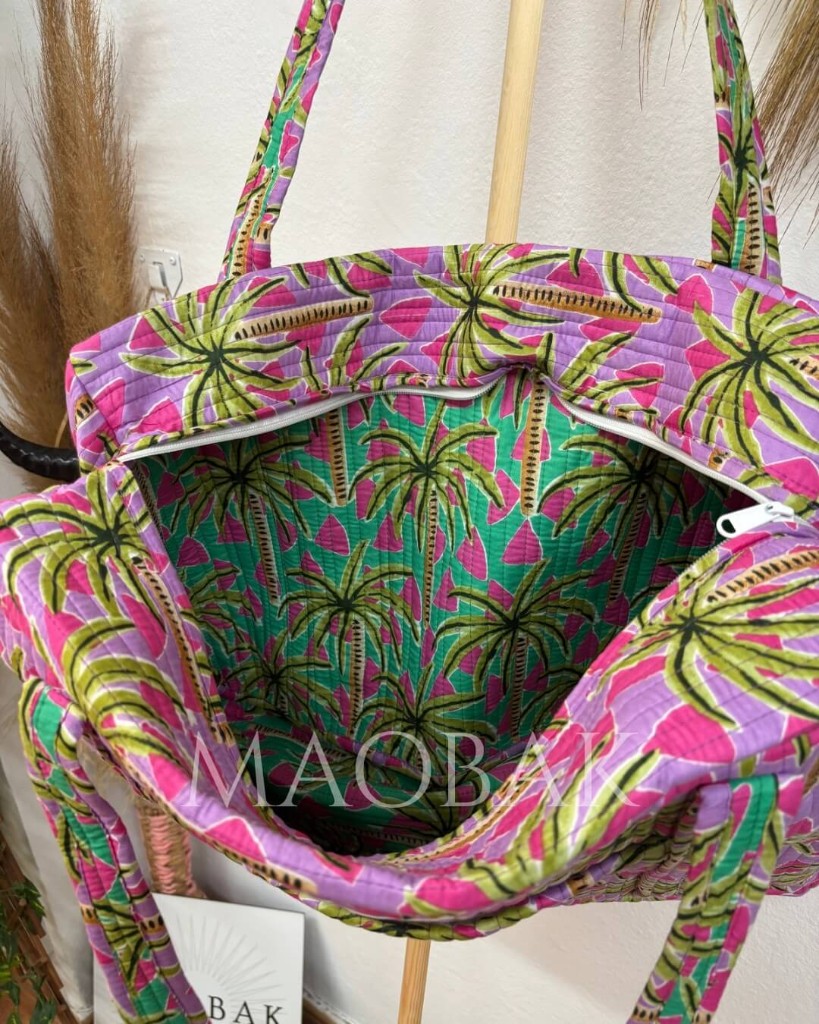 Bolso elaborado en algodón bordado y estampado. Tiene cremalleras tanto en los bolsillos como en la apertura principal. Gran capacidad, Medidas aproximadas: 60cmx40cm