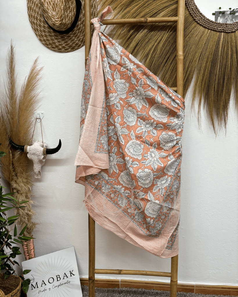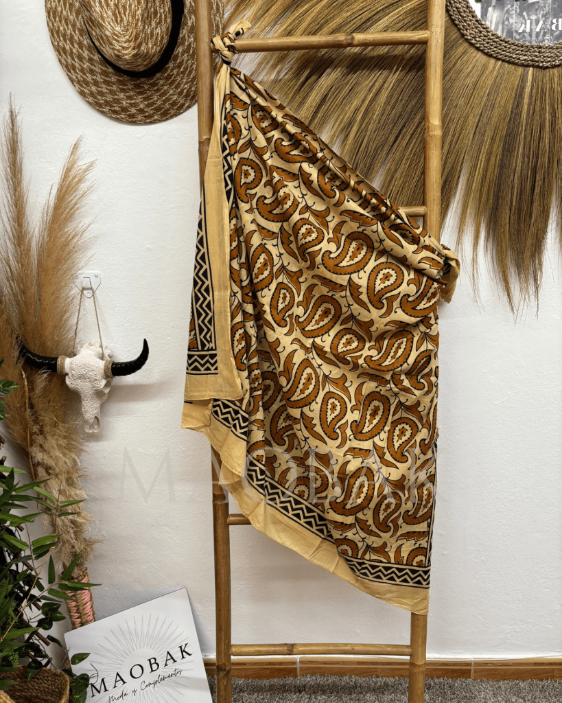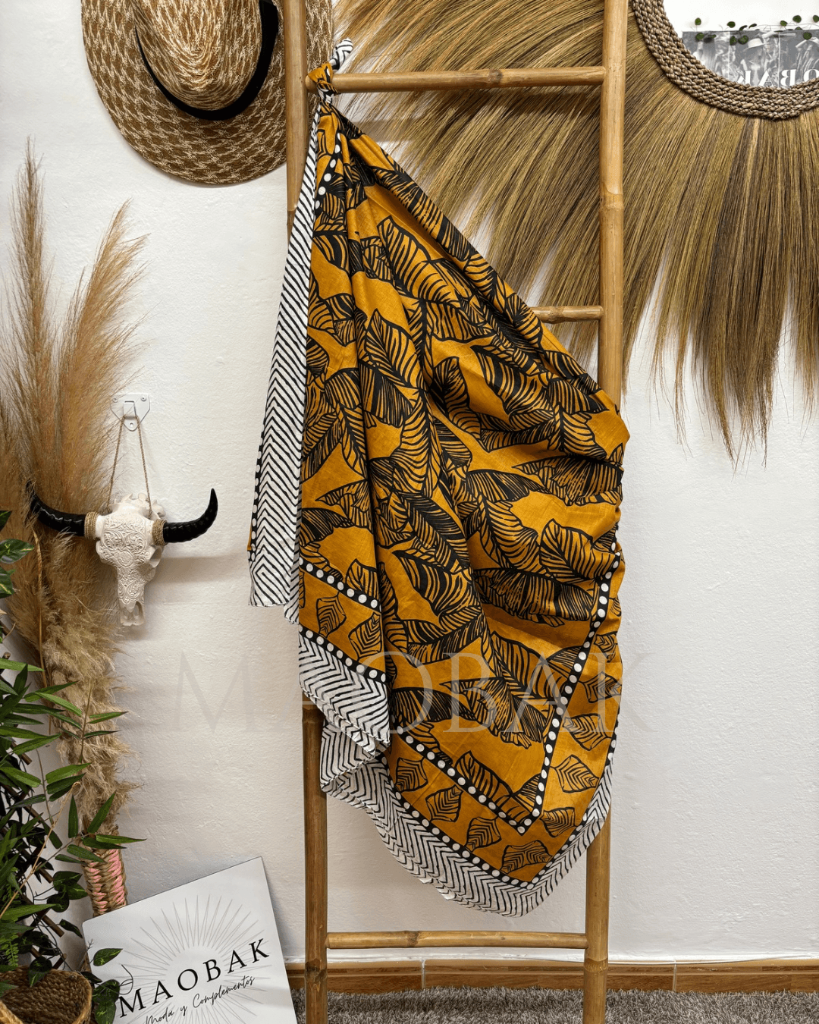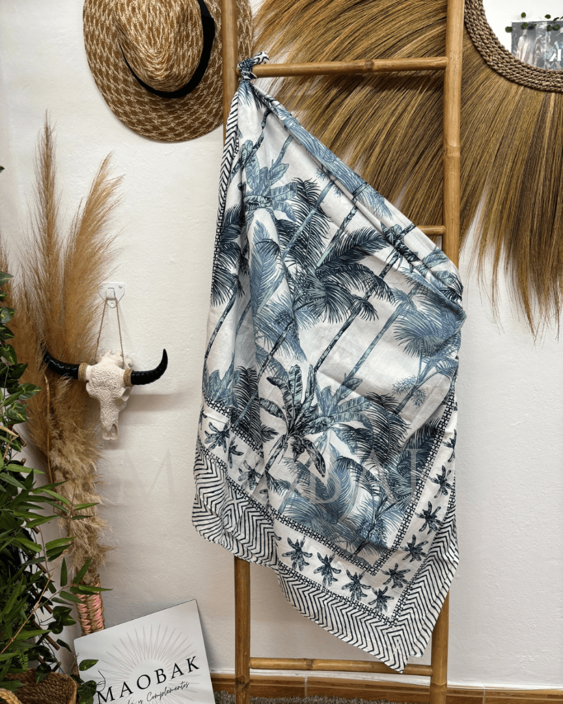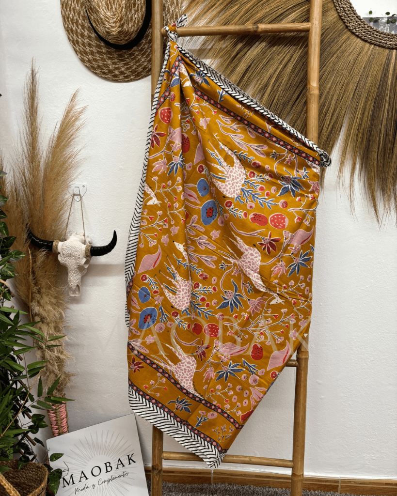 Ligero, versátil y lleno de carácter. Nuestro pañuelo Sahara está elaborado en algodón 100%, suave y transpirable, con un estampado artesanal que combina estampados con colores originales.
