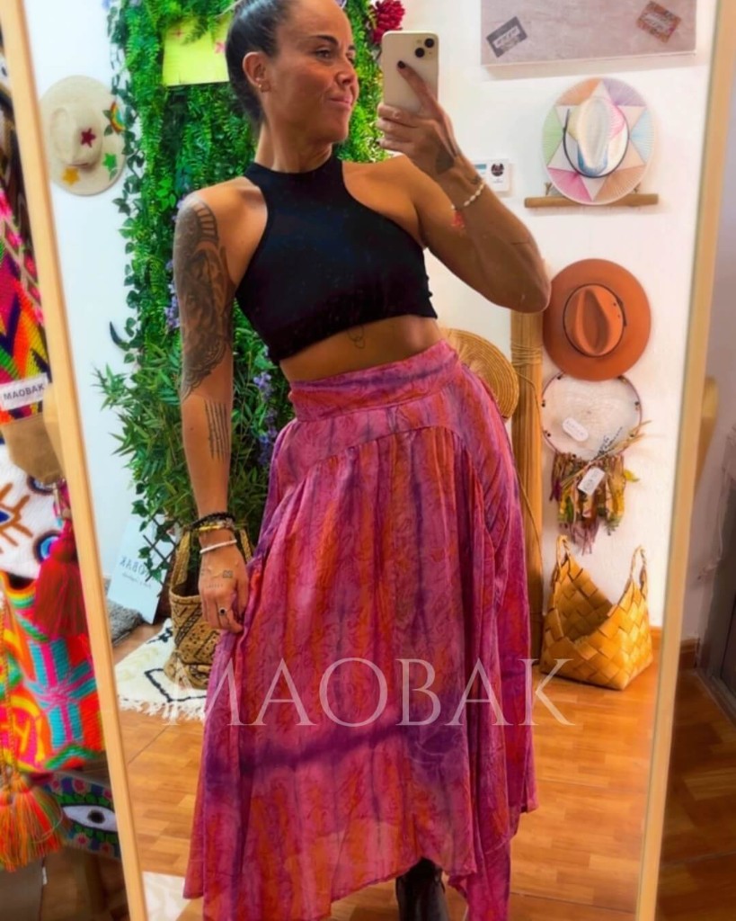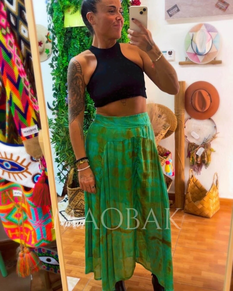 La Falda Srilanka está confeccionada en seda natural reciclada, ligera y llena de movimiento. Su estampado tie dye, teñido a mano, convierte cada pieza en una creación única e irrepetible.