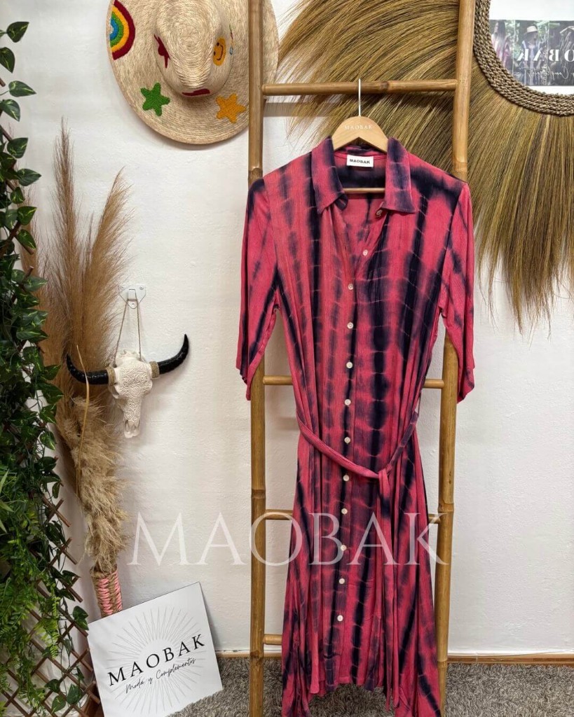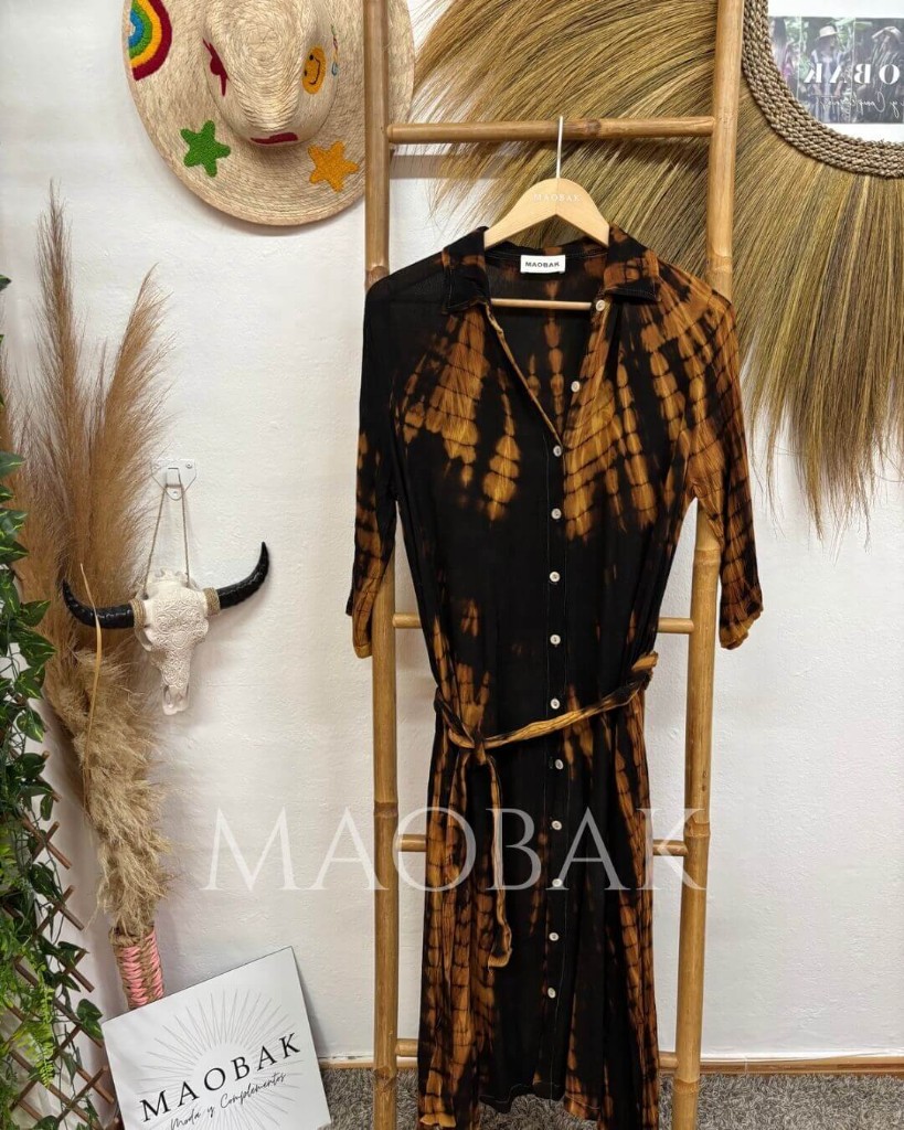 Cada prenda ha sido teñida a mano con la técnica artesanal tie-dye, creando un patrón único en cada vestido.