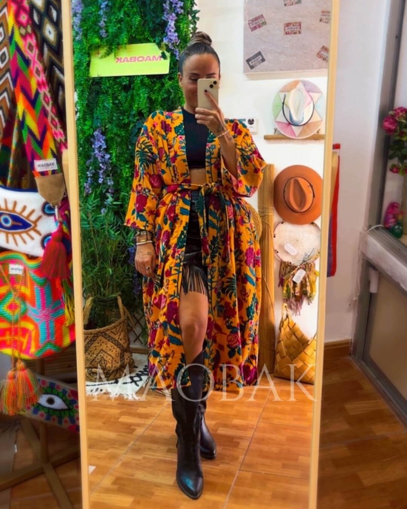 Su diseño maxi y fluido lo hace ideal para llevar como abrigo liviano, sobre un look boho o incluso como prenda protagonista en una ocasión especial.
